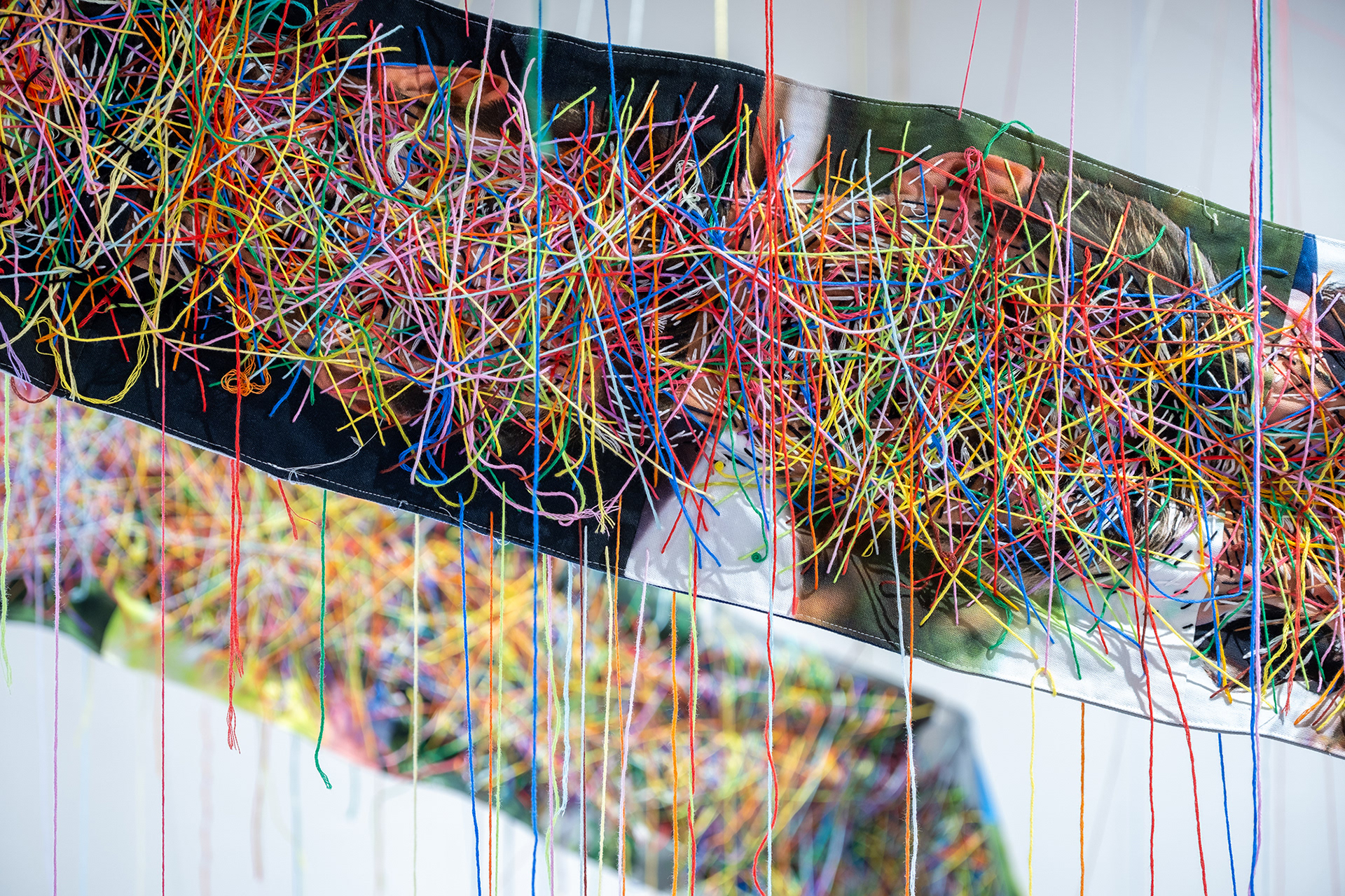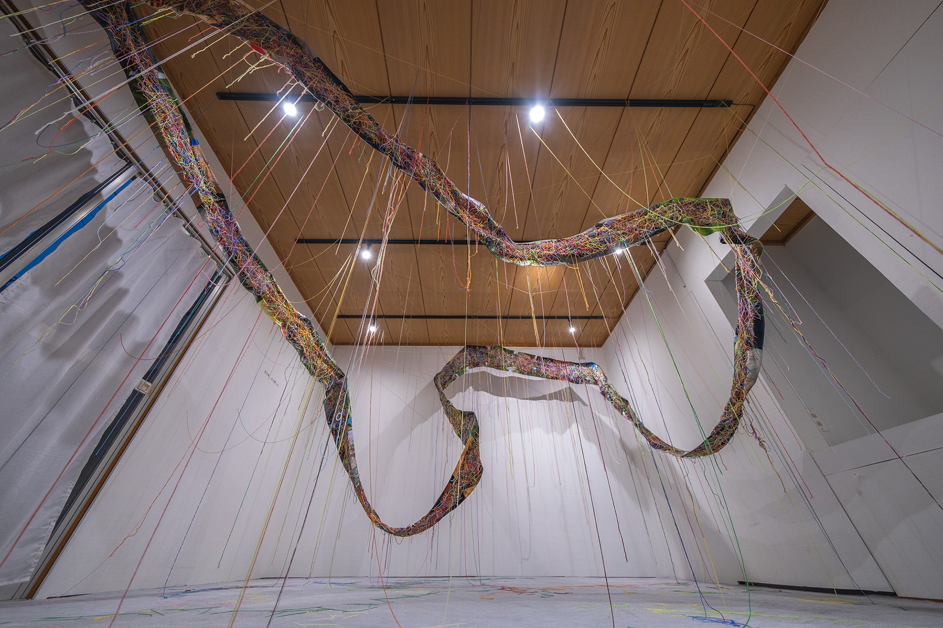 The AI-generated images were joined together to form a Mobius loop. Then, a thread was inserted into it. Some of the threads jumped out of the Mobius loop and connected to the space.