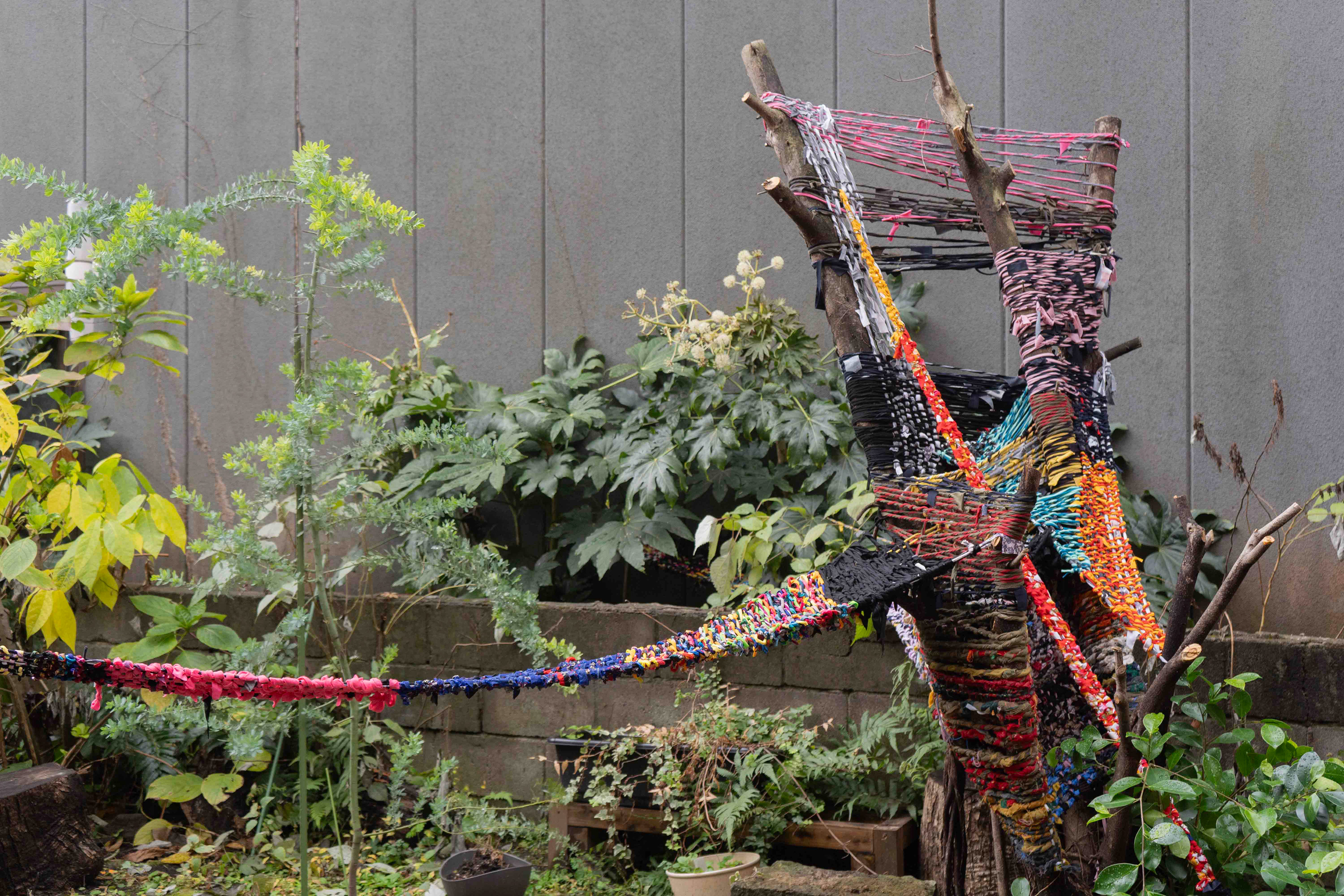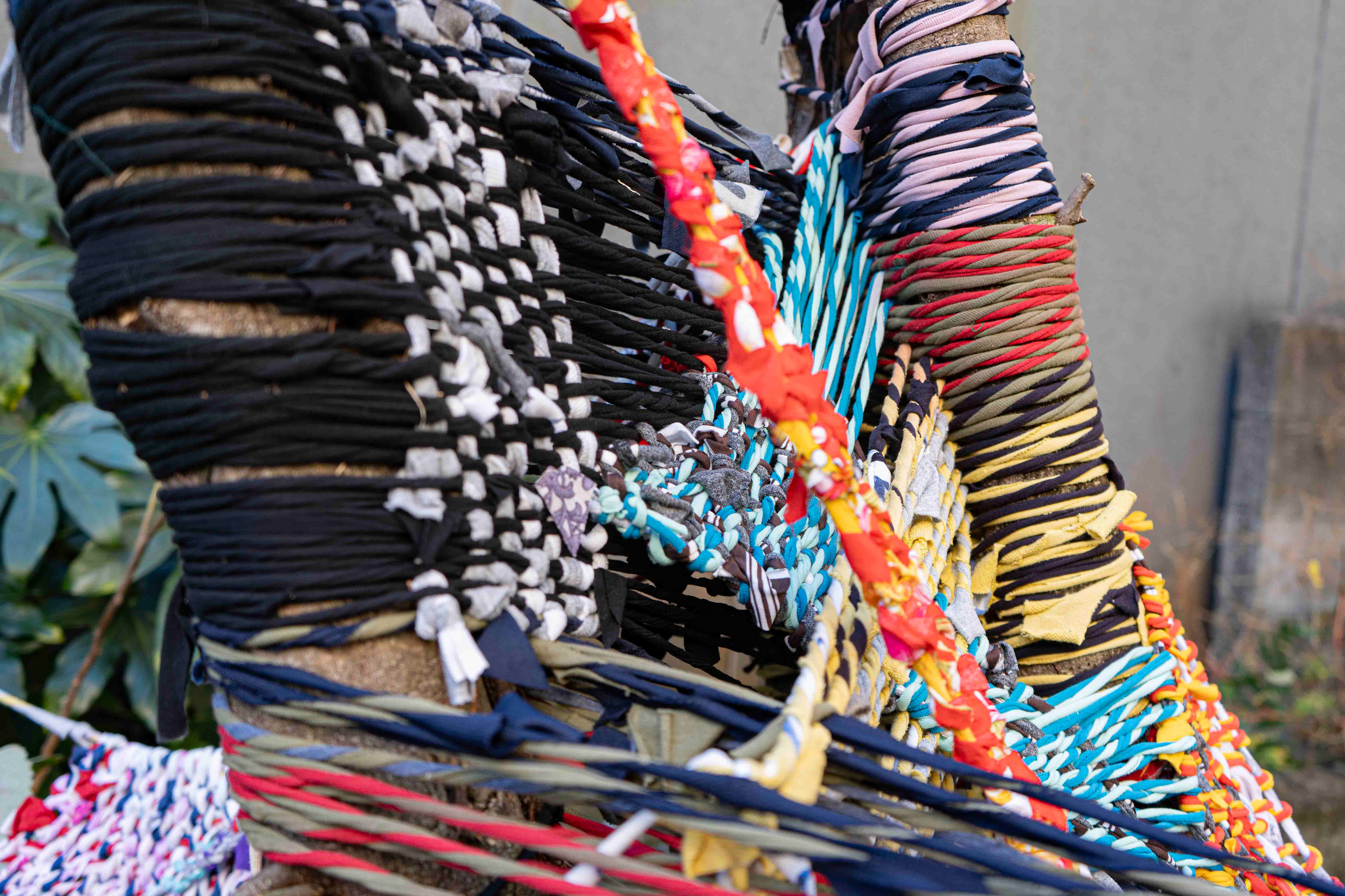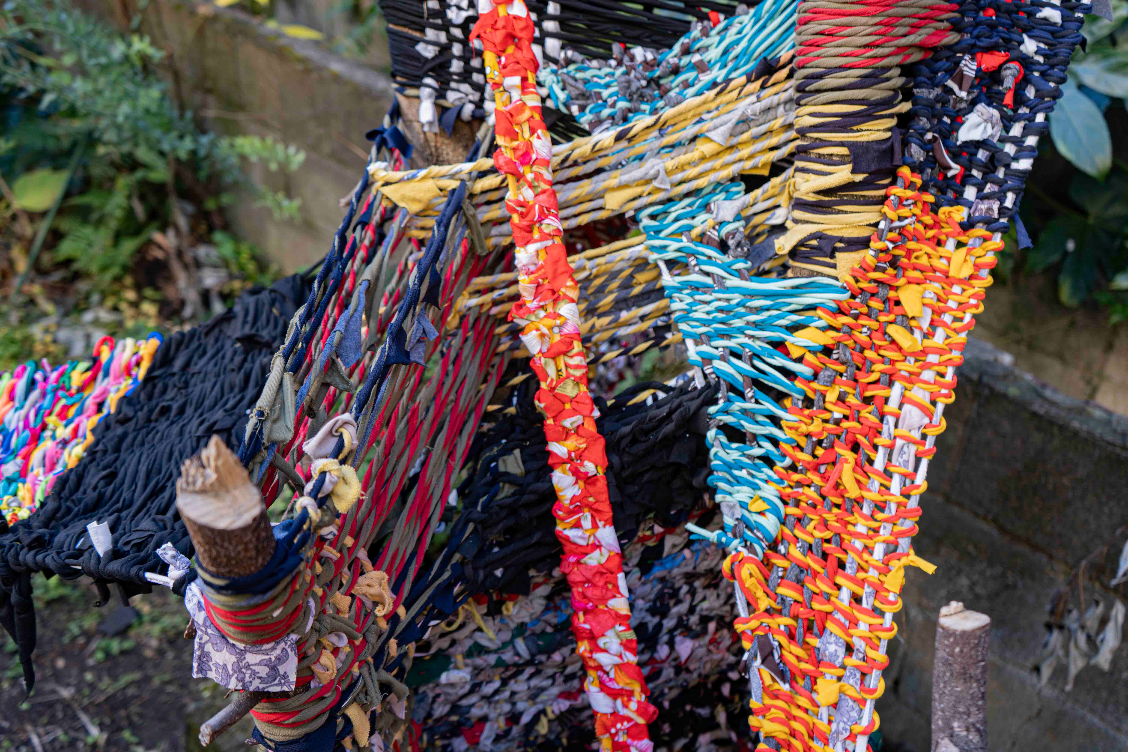 I cut the fabric into long strips. I twisted the strips together. And I wove them with nature.