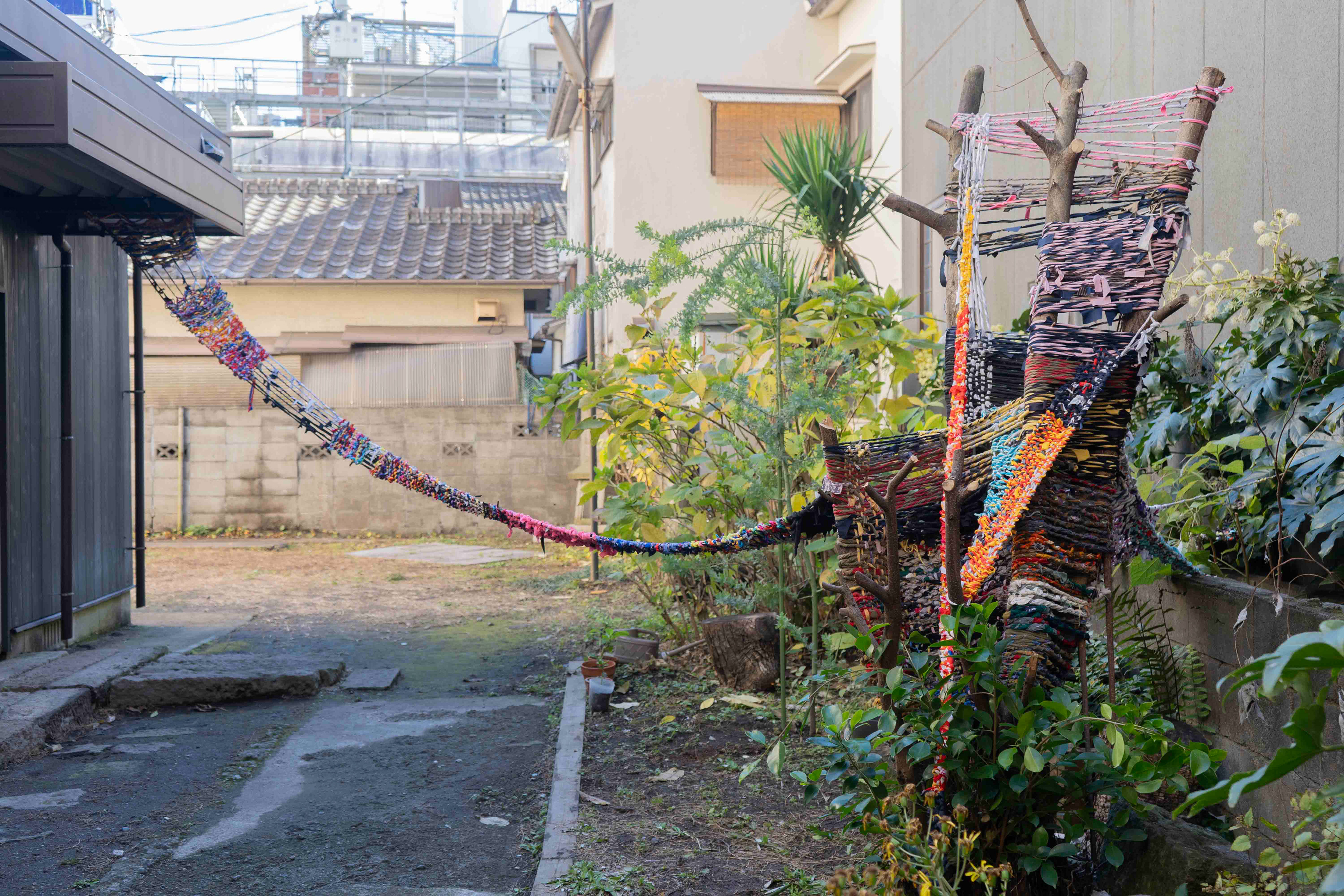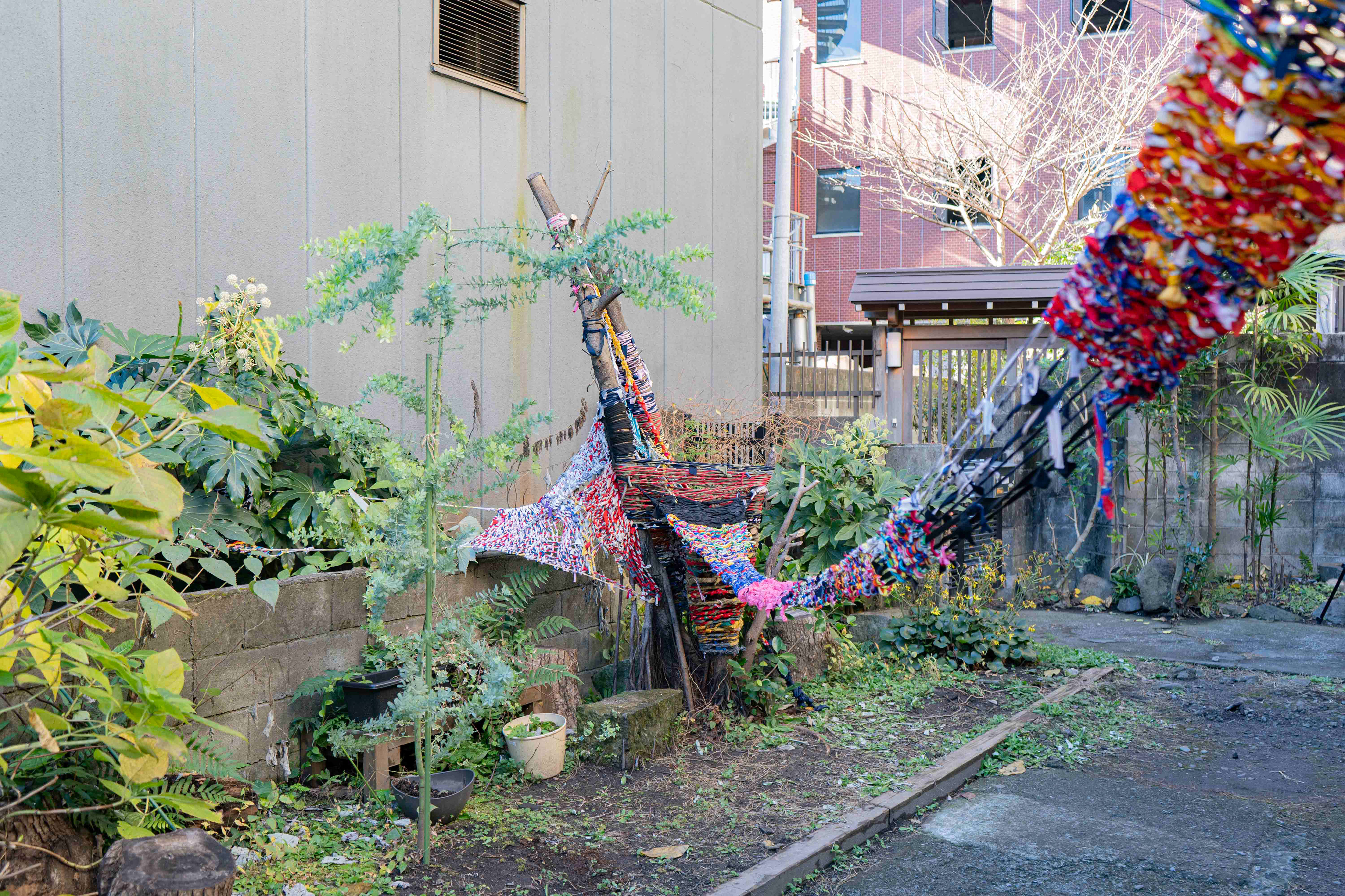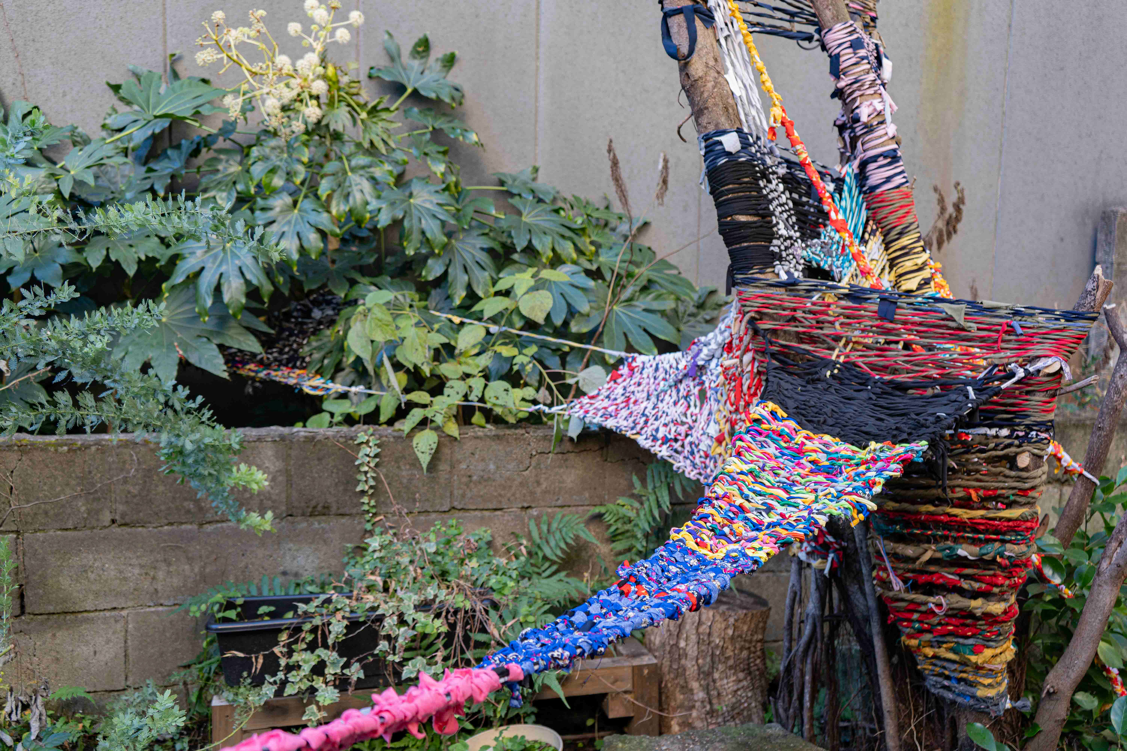 I cut the fabric into long strips. I twisted the strips together. And I wove them with nature.